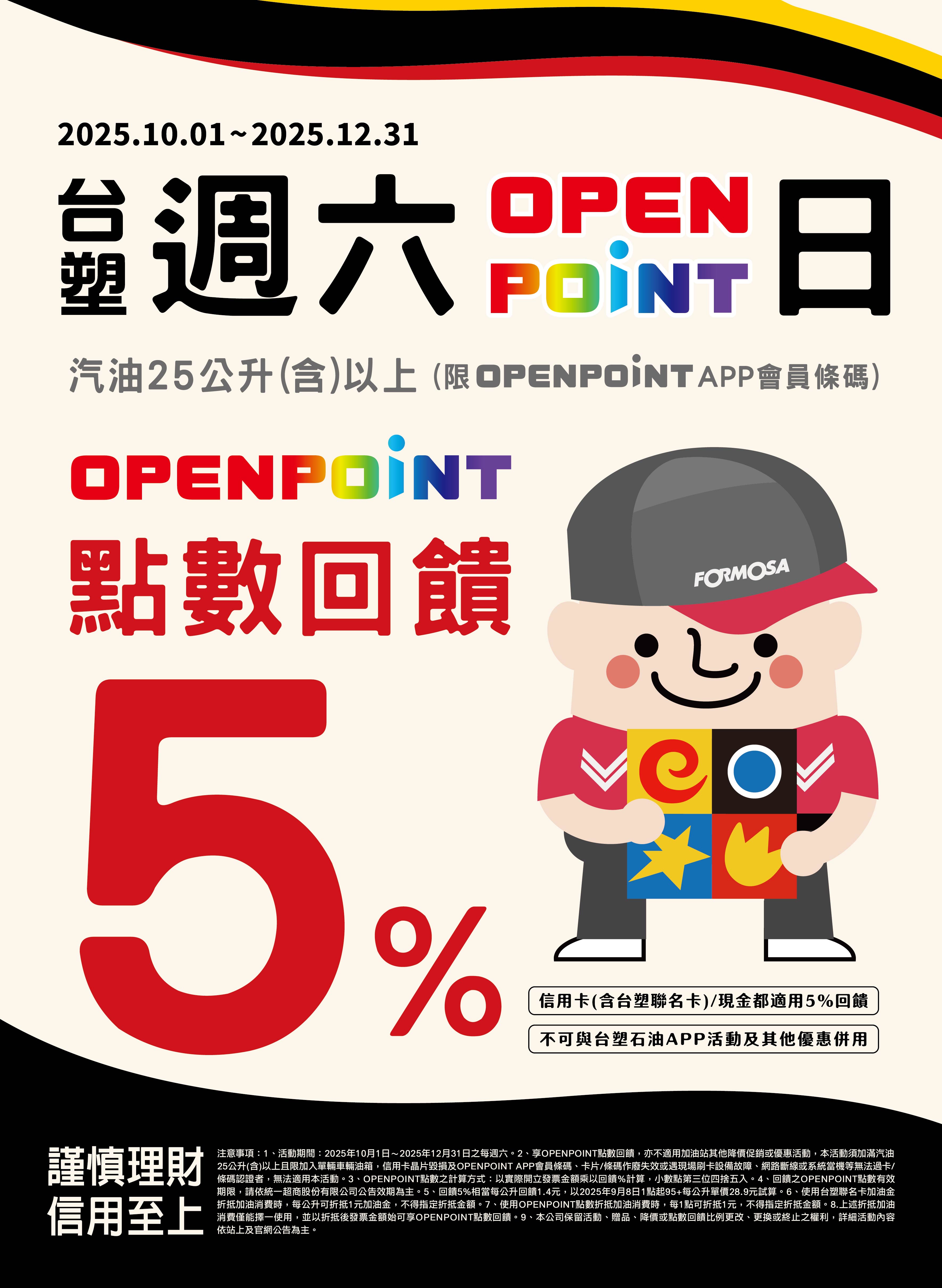 消費者於活動期間每週六至台塑加油站出示OPENPOINT APP會員條碼,汽油加滿25公升(含)以上享有OPENPOINT點數累點(人工、自助加油皆適用) ; 本活動不可與台塑石油APP活動及其他優惠併用。