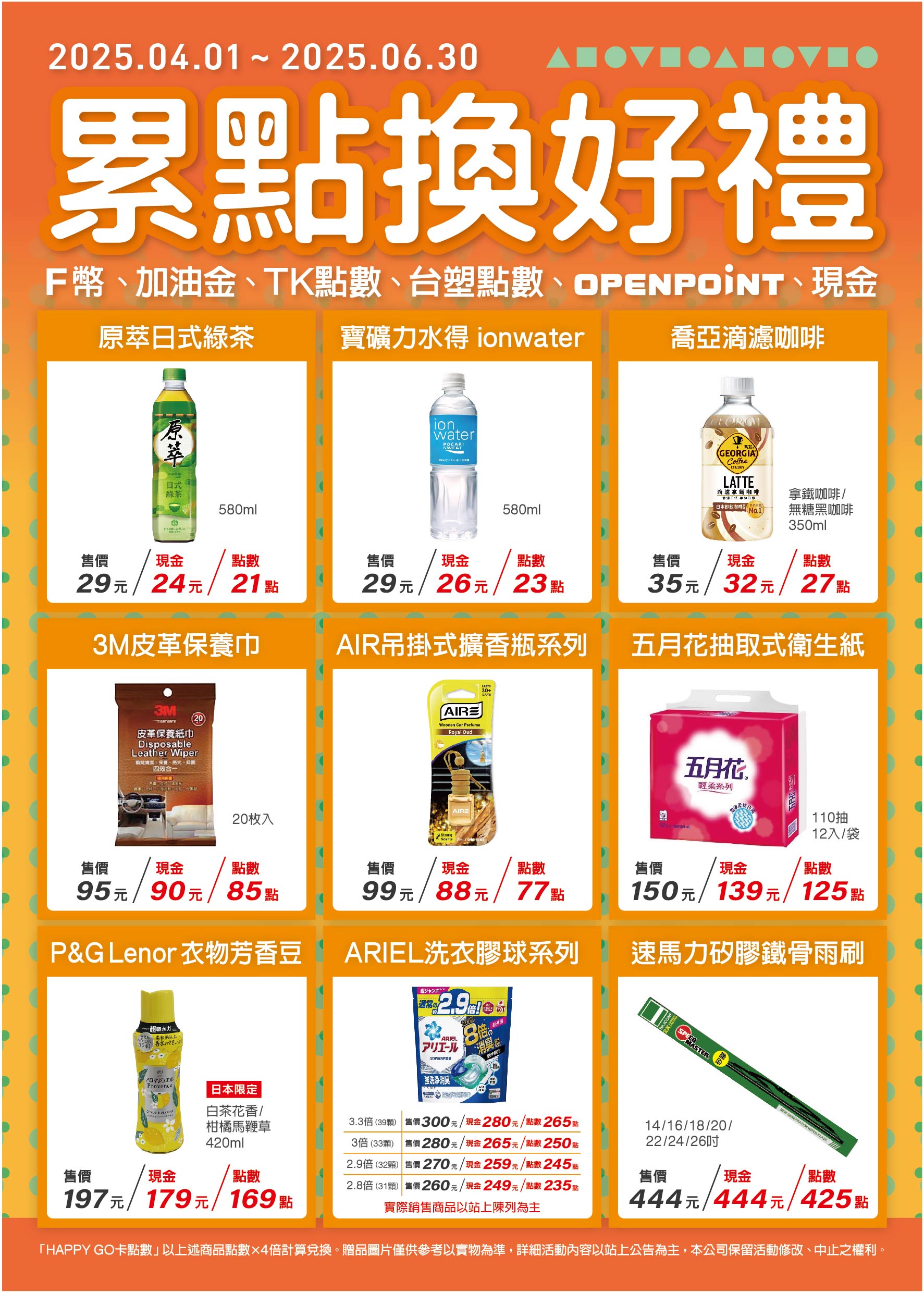 到台亞加油站以超優惠 F幣、台亞會員點、台塑聯名卡加油金/台塑點、OPEN POINT及Happy Go平台點數兌換精選民生必需商品(如下圖)。