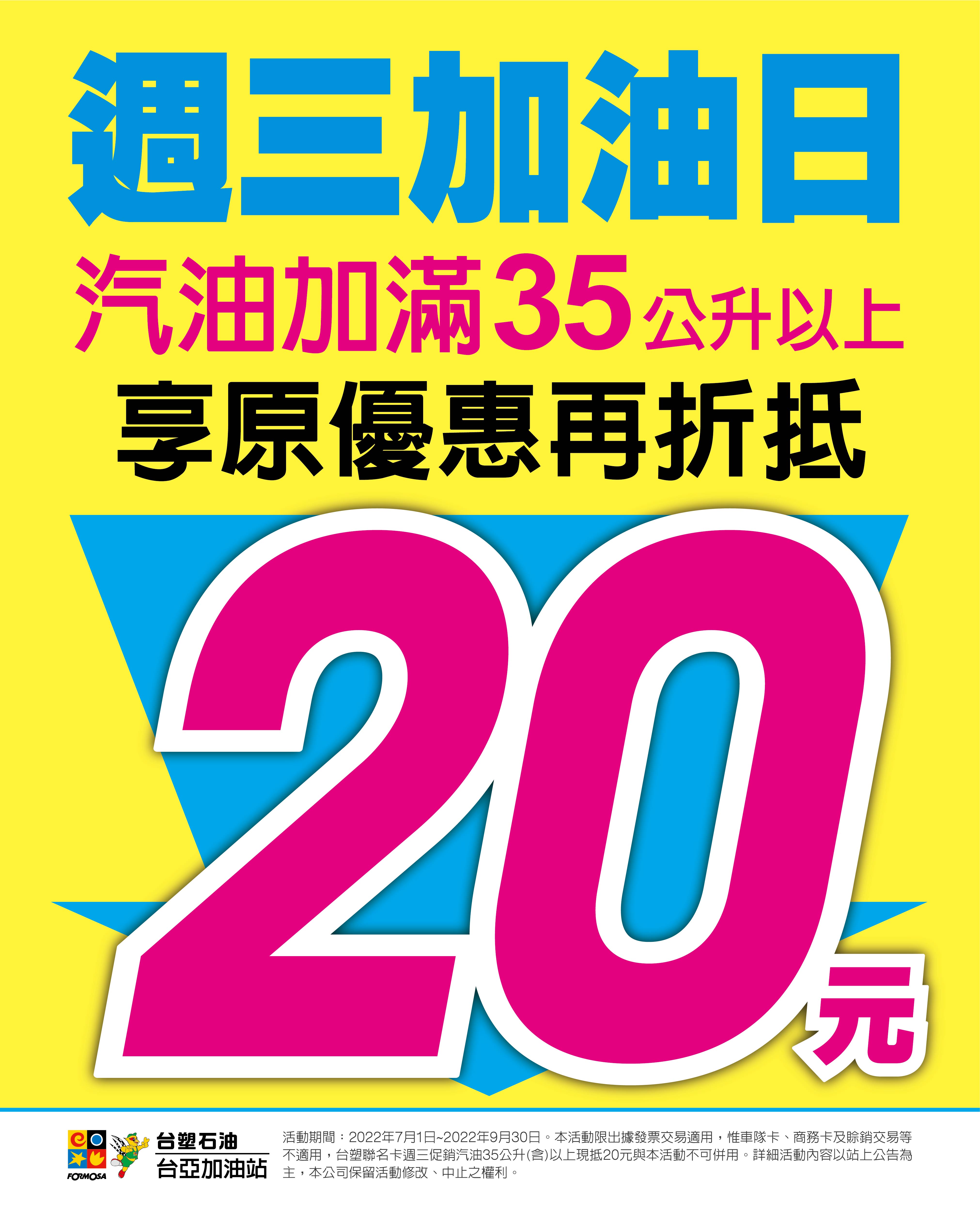 台塑週三加油日,加汽油滿35公升(含)以上,除享有加油站原優惠,再現抵20元-2022/7/1~2022/9/30(限週三)
